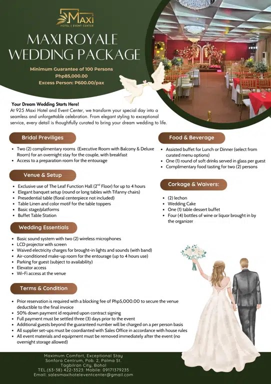 Turn your dream wedding into a grand celebration with our Maxi Royale Wedding Package where elegance meets exceptional service. Designed for couples who desire a more lavish and memorable experience, this package offers the perfect balance of sophistication, comfort, and seamless coordination.